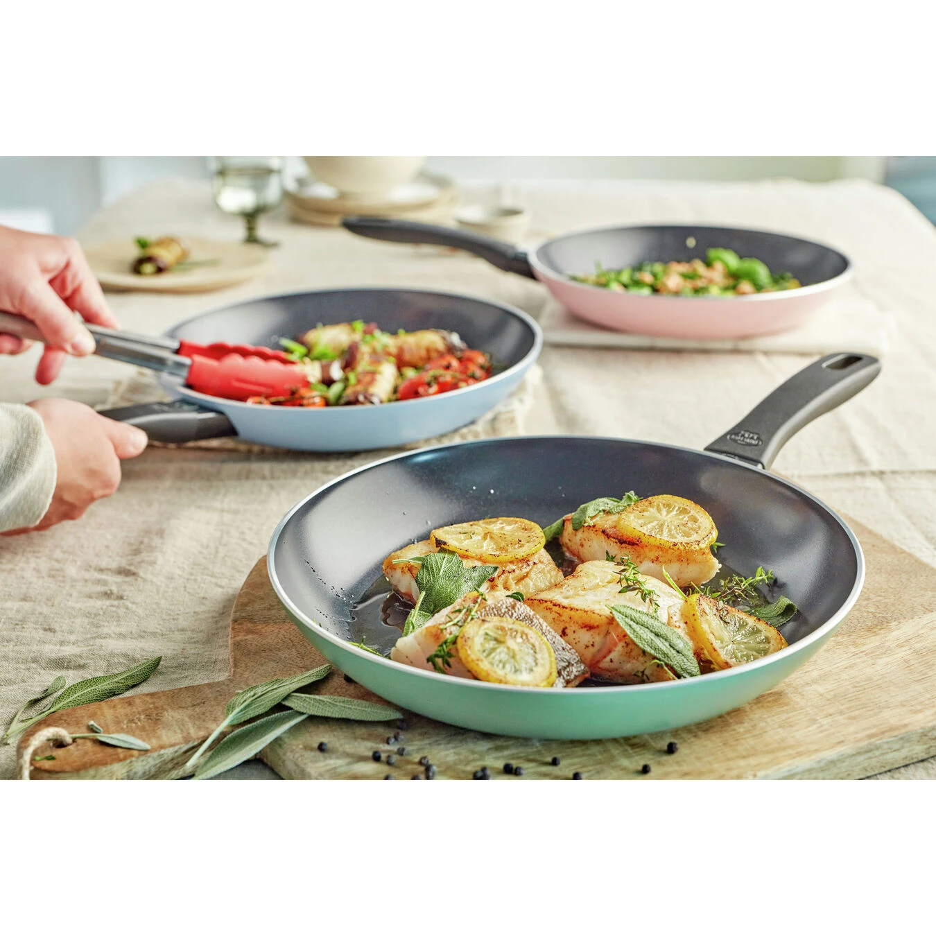- 3-delige koekenpannenset met: koekenpan 20 cm roze, koekenpan 24 cm blauw, koekenpan 28 cm groen